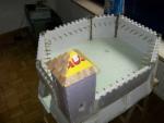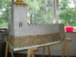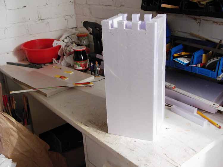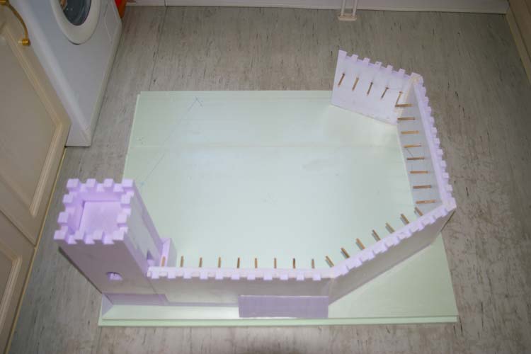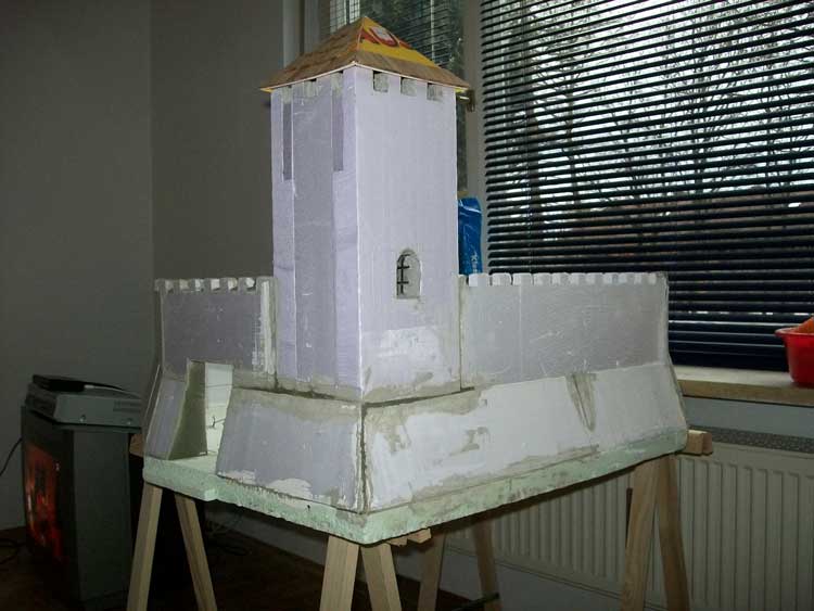 Die weiteren Schritte waren recht einfach. Es wurden aus großen Styrodurplatten die Wände der Burg geschnitten und schon mal zur Probe aufgestellt.