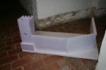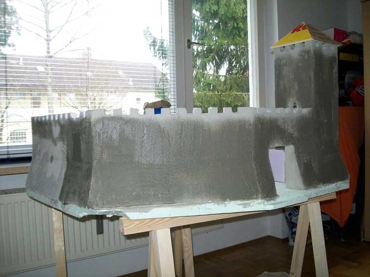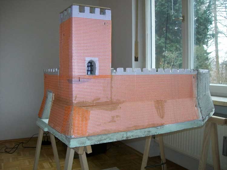 Nachdem alle Teile neu aufgebaut waren, habe ich um die ganze Burg ein Gewebe angebracht und anschließend mit dem selben Klebemörtel alles verputzt.