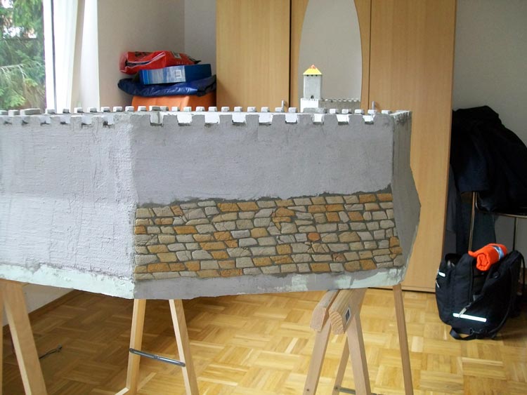 Möchte mal wieder ein wenig vom Weiterbau meiner Burg berichten. Nachdem ich die Burg wieder aufgebaut hatte und der Mörtel getrocknet war, habe ich mit der Gestaltung begonnen. Für die Aussenverkleidung der Burg habe ich mir bei der Firma Axstone Bruchsteine besorgt und den unteren, schrägen Berich der Burg damit verkleidet.