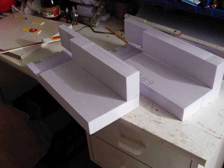 Nun gut, die Grundlage war geschaffen und ich wußte wie sie ungefähr aussehen sollte. Als nächstes stellte sich die Frage, aus was soll ich die Burg bauen? Beim Bau habe ich mich für Styrodur entschieden, welches sich wunderbar mit einem Catermesser schneiden lässt. Große Teile wurden mit dem heißen Draht zurecht geschnitten.