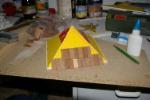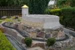 Alle Teile waren hergerichtet und bereit zum Zusammenbau. Im Frühjahr 2009 ging der Burgenaufbau los. Als Grundplatte dienten mir zwei Styrodurplatten die mit normalen Styrodurkleber zusammen gesetzt wurden. Mit dem gleichen Kleber wurden die Bauteile aneinander gesetzt. Somit hat die Burg die Maße 1,20m in der Länge und 0,80m in der Breite. Zusätzlich bekommt der Turm noch ein Dach. Das Unterdach besteht aus PVC Platten (die selben wie beim Lokschuppen) als Abschluß kommen noch Holzschindeln aus Rotzeder drauf.