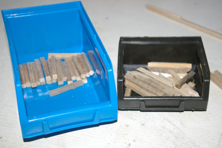Soweit, Sogut. Ich wußte nun wie sie aussehen soll. Also schnell ans Laptop gesetzt und eine Zeichnung erstellt. Das Material lag auch schon seit längerer Zeit im Keller. Als Material habe ich zum einen 5mmx5mm, 6mmx6mm (welche ich auf 5x6 geschnitten habe) und 7mmx7mm Leisten (welche ich auf 5x7 geschnitten habe) genommen. Mit Hilfe der Tischkreissäge waren die benötigten Teile rasch auf die erforderlichen Längen geschnitten.