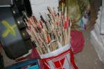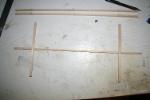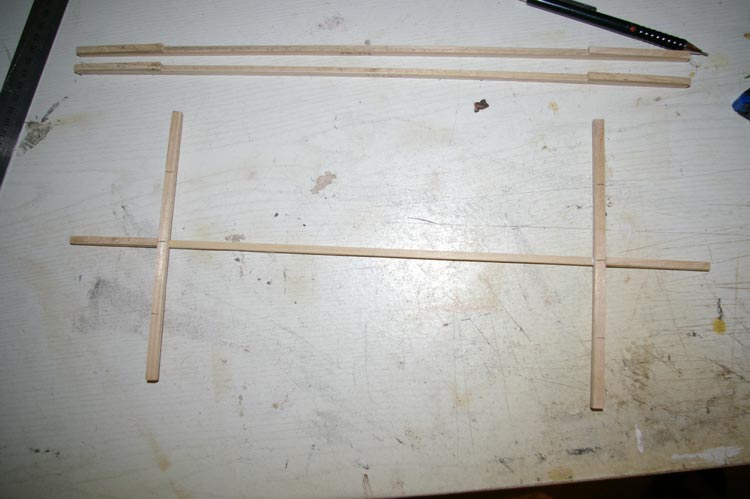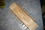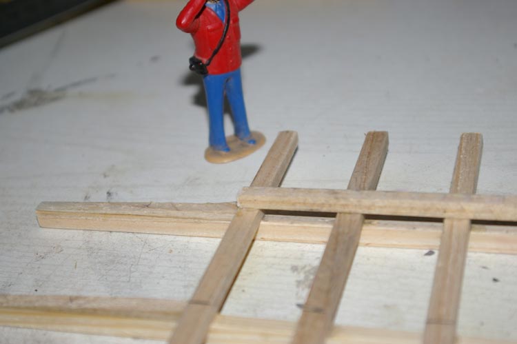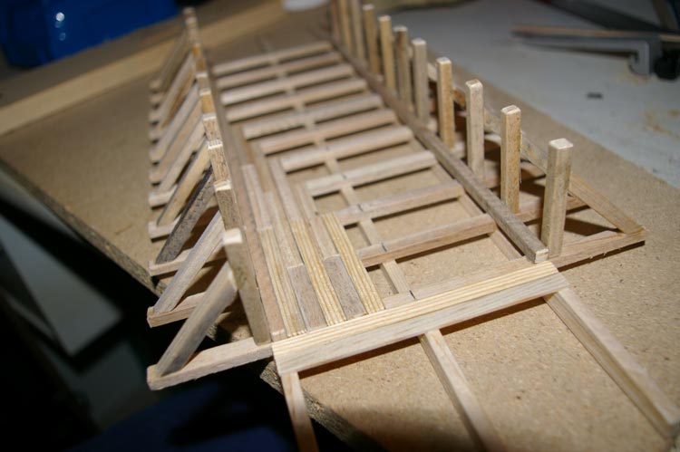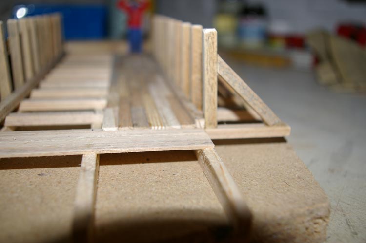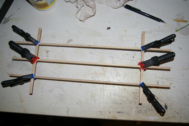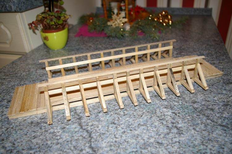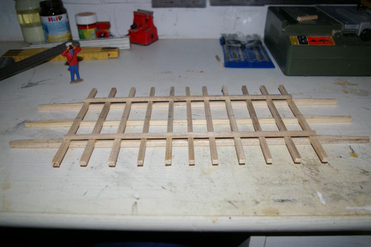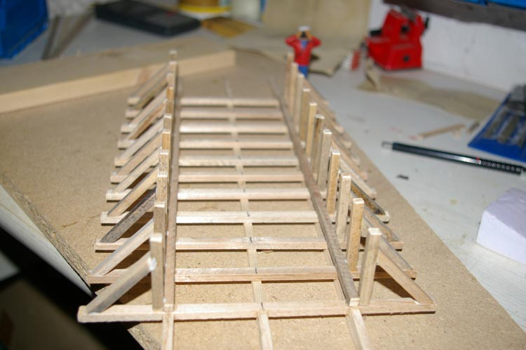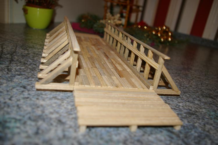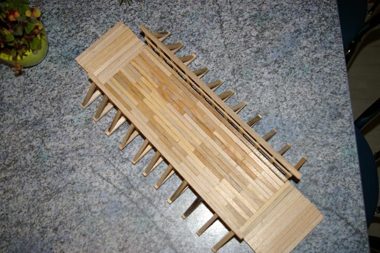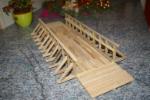 Beim Zusammenbau der Brücke habe ich damit angefangen die drei Auflagerhölzer (7mmx5mm) an beiden Enden mit 7cm langen und 5mm hohen Keilen zuversehen. Die Keile dienen später dazu den Belag, im Split, schräg auslaufen zulassen. Als nächstes habe ich ein Auflager mittig auf den ersten und letzten Querriegel (5mmx6mm) geleimt und mit Leimzwingen fixiert. Man muß natürlich auf den rechten Winkel achten. Nach kurzer Trocknungszeit habe ich das linke und rechte Auflager ebenfalls mit Leimzwingen befestigt.