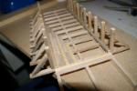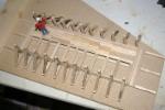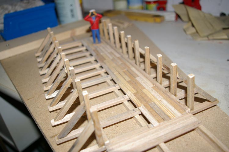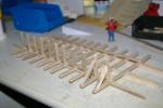 Nach einer Nacht ging es am nächsten Tag weiter. Als nächstes habe ich mit dem Geländer weiter gemacht. Zuerst wurden alle senkrechten Pfosten (5mmx5mm) aufgeleim. Nachdem der letzte Pfosten gesetzt war ging es mit den schrägen Pfosten (5mm x 5mm) weiter. Da der Leim noch nicht ganz angezogen hatte konnte man mit den schrägen Pfosten noch sehr gut Korrekturen, was denn Winkel angeht,vornehmen. Das selbe mußte dann auch auf der zweiten Seite gemacht werden.