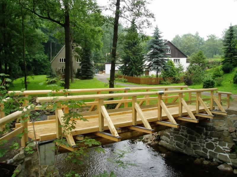 Nachdem der Belag abgeschlossen war wurde nur noch das Geländer und die Handläufe angebracht. Zum Abschluß wird die Brücke an einigen Stellen nochmal mit Schleifpapier bearbeitet und im Anschluß wird sie mit Imprägnierung und Lasur gestrichen.