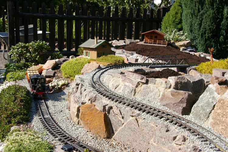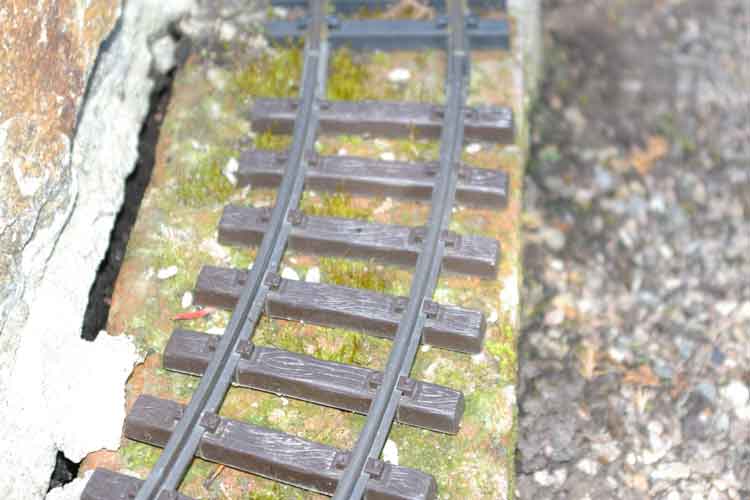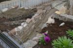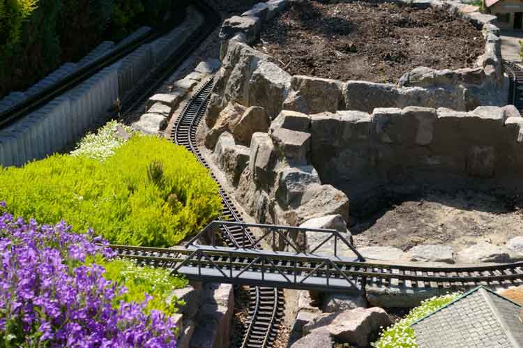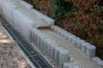 Erst im März war es mir möglich die Winterschäden zubeheben. Hier hatte der Frost und Schnee dem Unterbau für die Gleise mächtig zugesetzt. Am stärksten waren die Gleise um die Burg und der Auffahrt zur Burg betroffen. Mir blieb nur eine Möglichkeit, ich mußte den Unterbau komp. entfernen und mit reichlich Beton unterfüttern und neu aufbauen. Als Abschluß wurde die Randeinfassung mit sehr viel Natursteinen, Beton und Zementmörtel befestigt.
