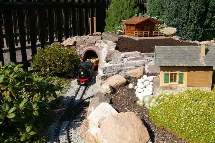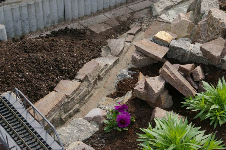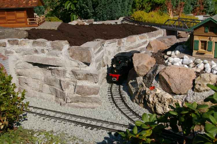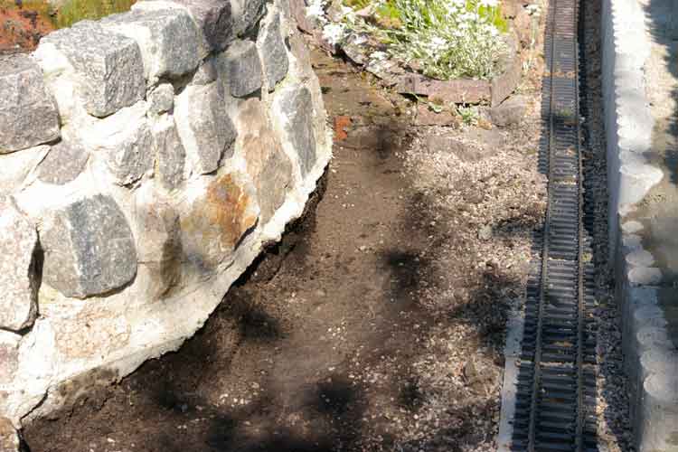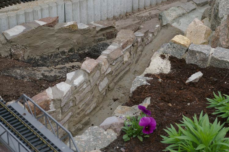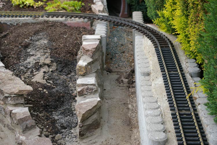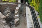 Der Juli begann damit meine Anfangsfehler zu beheben. Die Aufgabe bestand darin die lose verlegten Natursteine im Bereich des Tunnels neu zuverlegen. Das lose übereinanderlegen der Steine sollte sich im Laufe der letzten Jahre rächen. Hier hatte ebenfalls das Wetter mit Regen, Schnee und allem was dazu gehört dafür gesorgt das die Erde, die hinter den Steinen war, ausgespüllt wurde. Somit verlor der Hang an Stabilität und war kurz davor auf die Gleise zu stürzen. Somit blieb mir nur eins, ich mußte alles abbauen und wieder kam reichlich Zementmörtel zur Anwendung um dem Hang zusichern.