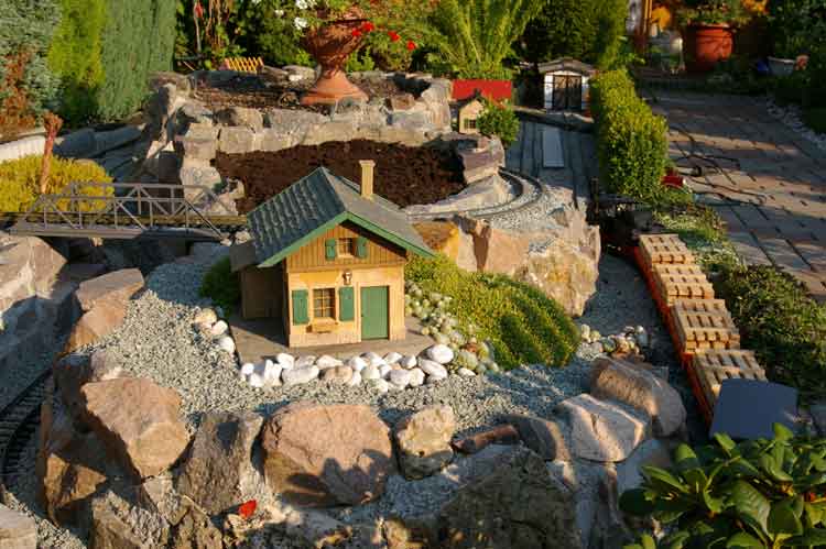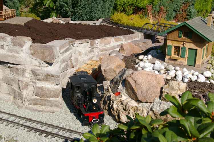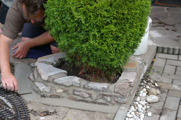 Nachdem die groben Arbeiten beendet waren begann das Feintuning. Zum einen habe ich eine Mauer um die Konifere gemauert somit läuft mir nicht mehr, bei Regen, die ganze Erde auf die Anlage. Zum anderen habe ich noch eine Zufahrt und einen kleinen Weg zum Lokschuppen angelegt. Bei der ganzen Aktion ging wieder ein ganzer Sack Mörtel drauf. Ich denke mal das wird nicht der letzte gewesen sein. Eine neue Mauer um den Lokschuppen wurde auch mit reichlich Natursteinen und Mörtel gesetzt.