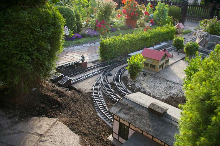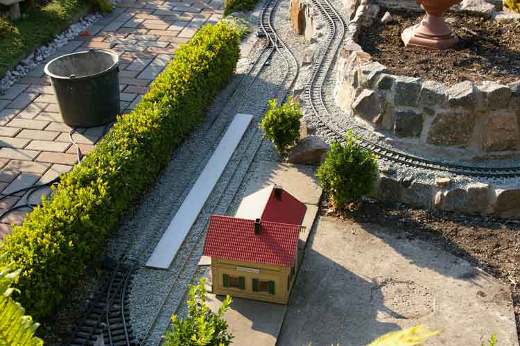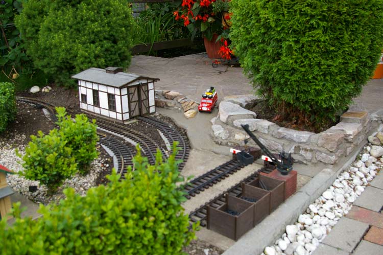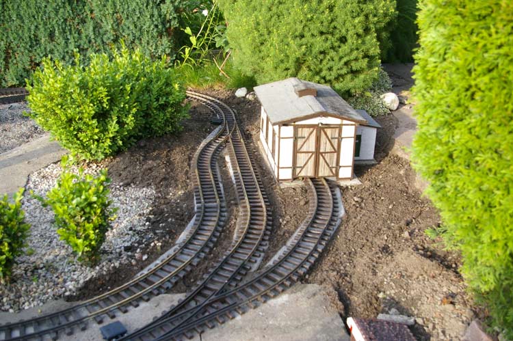 Bei dieser Gelegenheit habe ich auch gleich die alte Gleistrasse entfernt. Als neuen Unterbau habe ich mich wieder für Rasenmähkanten entschieden. Die alte Trasse hatte ich am Anfang meiner Gartenbahnzeit noch aus Beton gefertigt. Bei den Mähkanten hat man den Vorteil man kann sie schnell versetzen, wenn man mal wieder die Gleisführung ändern will. Durch den so entstandenen Platz ergeben sich neue Möglichkeiten, zum einen kann ich meinen Lokschuppen wieder bedienen und zum anderen habe ich zwei zusätzliche Abstellgleise gewonnen.