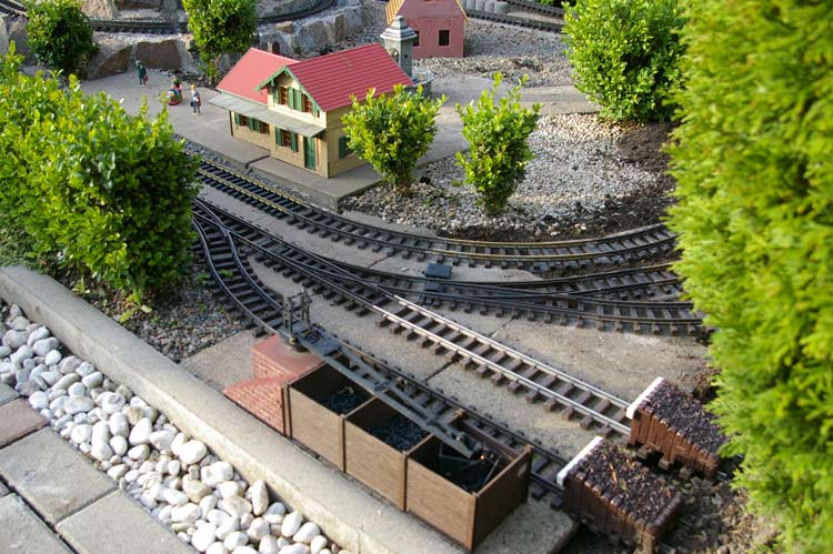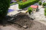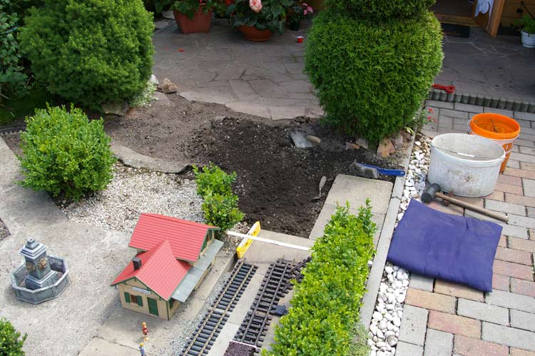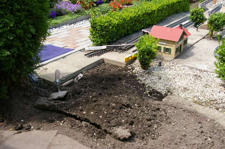 Da ich durch die Neugestaltung, des Bahnhofes, meinen Lokschuppen nicht mehr bedienen konnte mußte im hinteren Bereich der Anlage etwas passieren. Der erste Schritt war der das ich den Pflanzhügel dem Erdboden gleich gemacht. Der Grund dafür war, das auf diesem Hügel ein Farn angepflanzt wurde und dieser jedes Jahr mit seinen sch... großen Wedeln mir die ganze Sicht und manchmal auch das fahren erschwert hatte. Zum zweiten hatte der Farn unter der Erde seine Triebe ausgebreitet, diese Triebe wiederum haben alles was über ihm war nach oben gehoben (Betonplatten, Häuser, Gleise etc.)