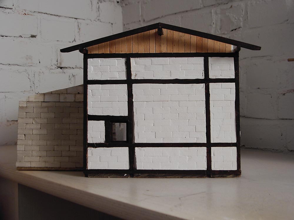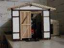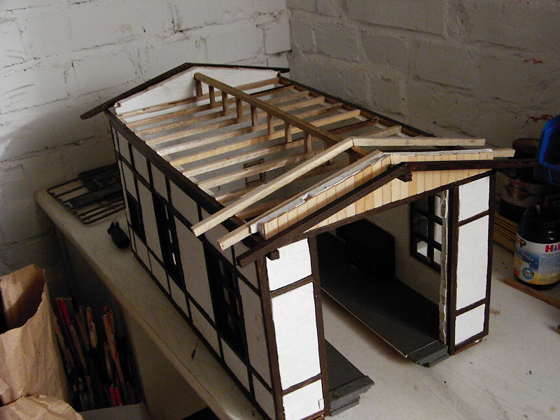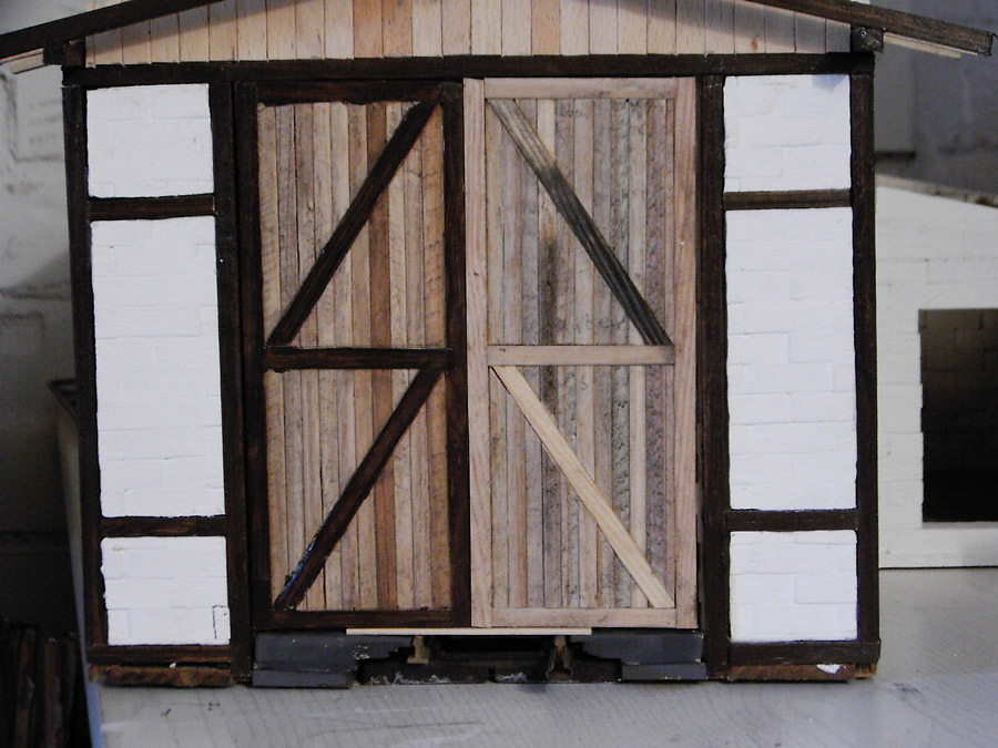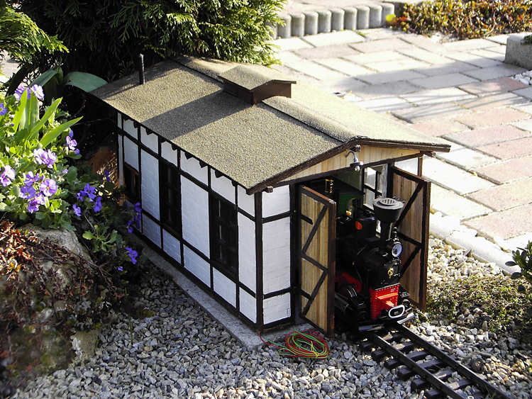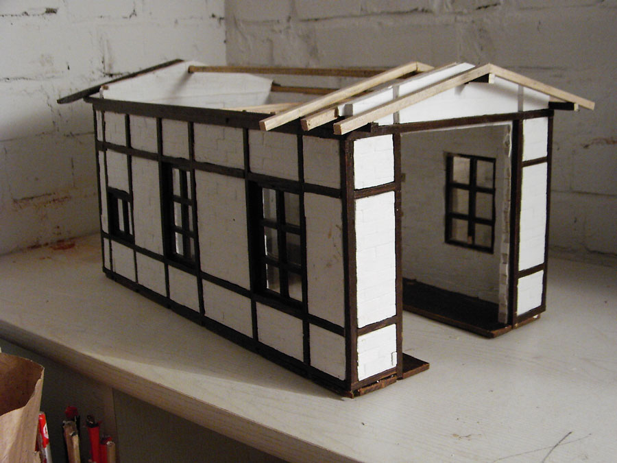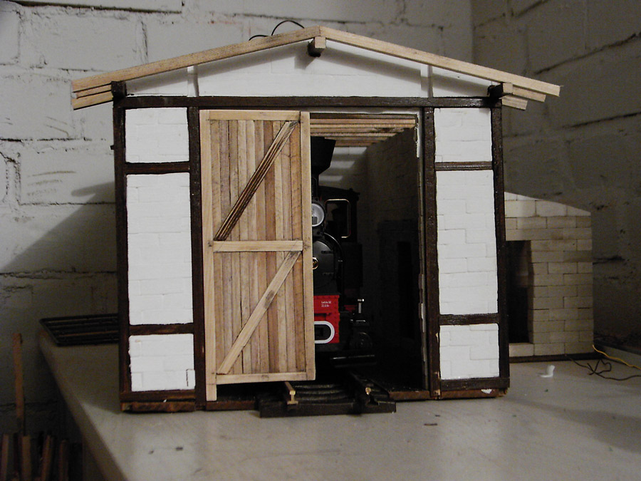 Fertigstellung des Fachwerkeinbaues, Einbau von Fenstern und Türen, Innenwänden und Einrichtungen, Erhöhung des Fußboden´s auf Schienenoberkante, Herstellen der Schuppentore, Errichten des Daches, Einbau von Beleuchtung