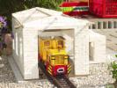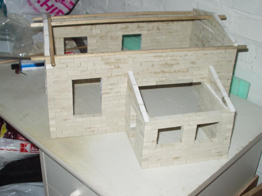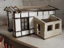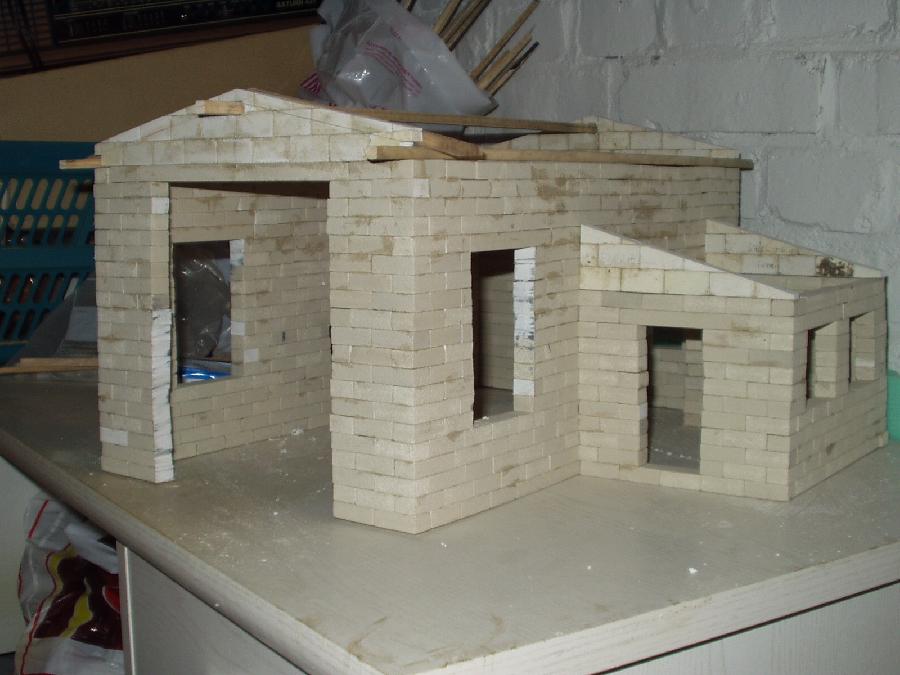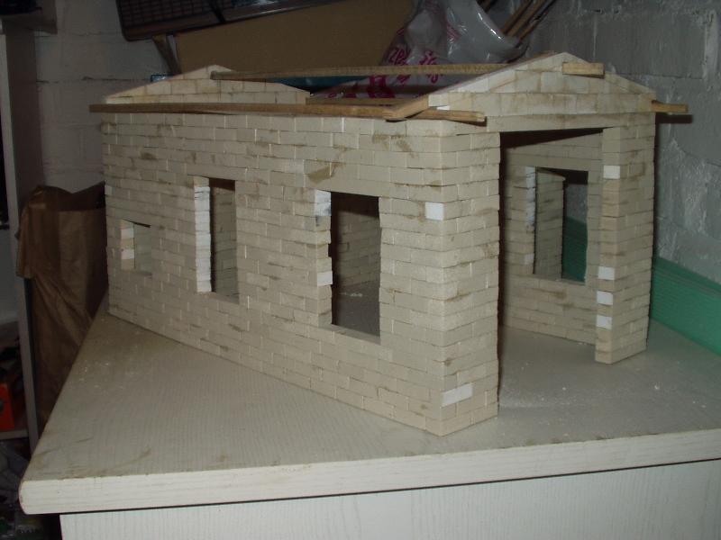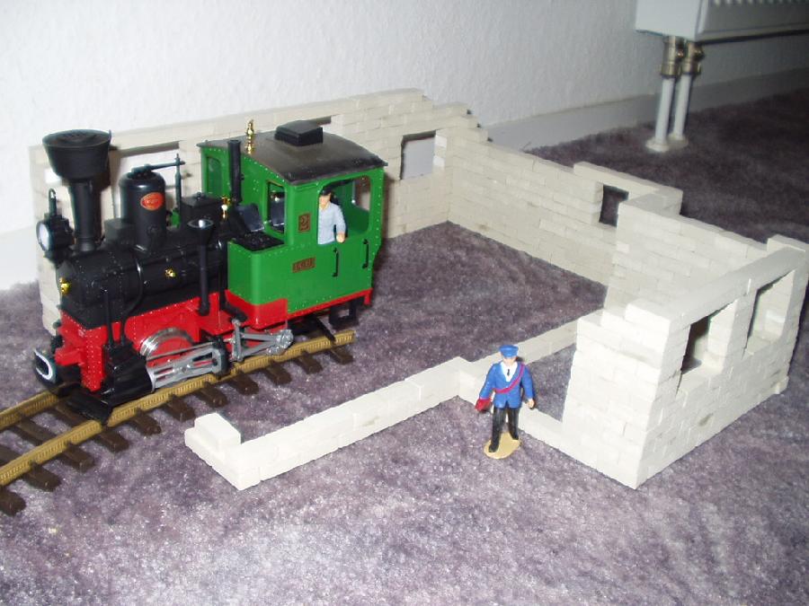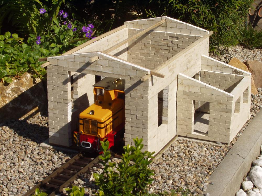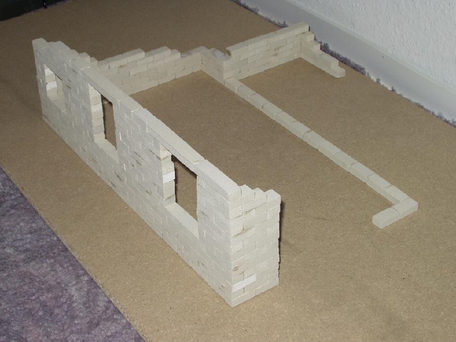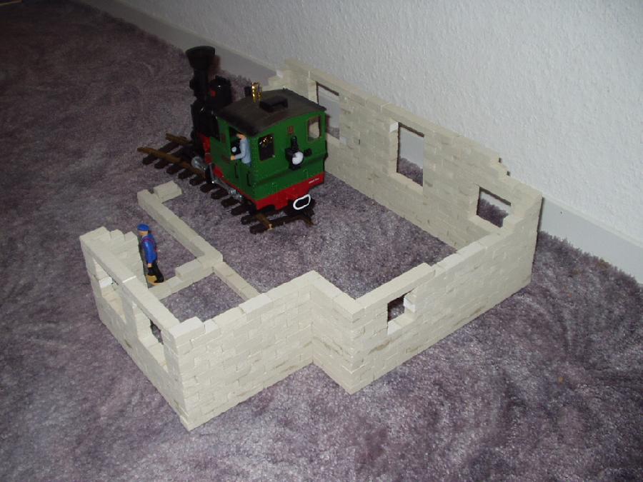 An dieser Stelle möchte ich den Selbstbau meines Lokschuppens vorstellen. Als Vorbild habe ich mir den Lokschuppen "Rosenbach" von PIKO genommen. Die Baumaterialien bestehen aus Kunststoffsteinen die ich das erste mal auf der Modell und Hobby in Leipzig gesehen habe. Von dort habe ich mir 100 Stk. mitgenommen, die aber sehr schnell verbaut waren und ich gleich 1000 Stk. nachbestellen mußte. Die Steine haben die Abmaße 1,0cmx1,5cmx3,0cm und werden mit Dachrinnenkleber zusammen gefügt.