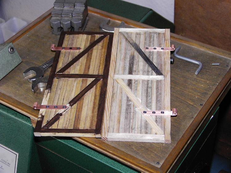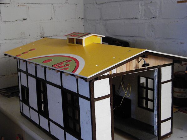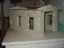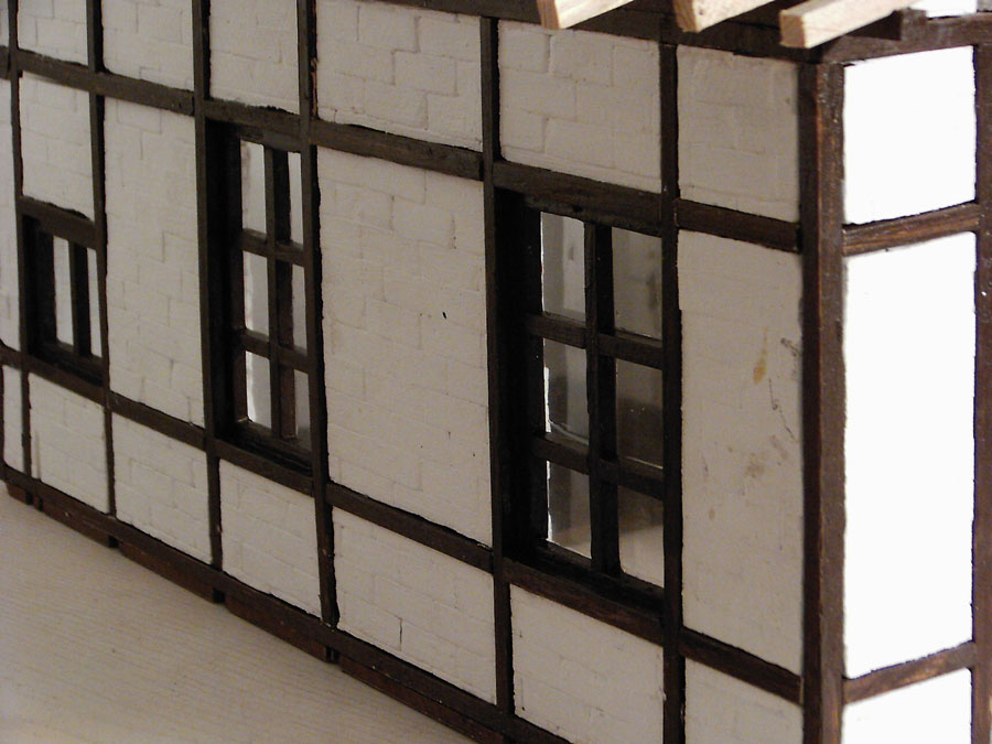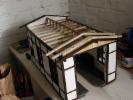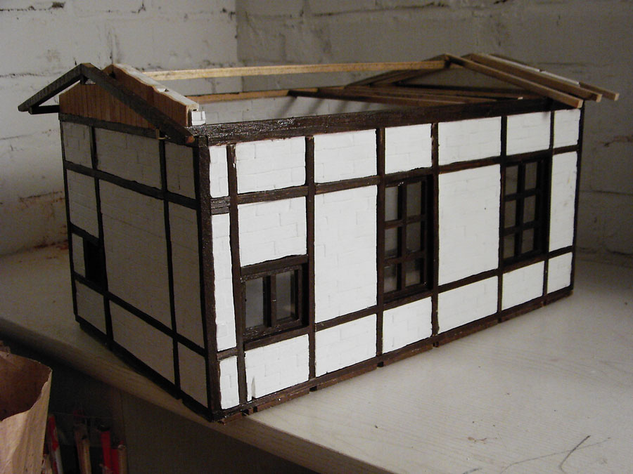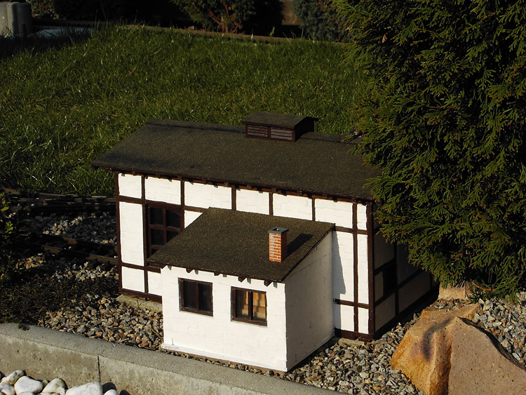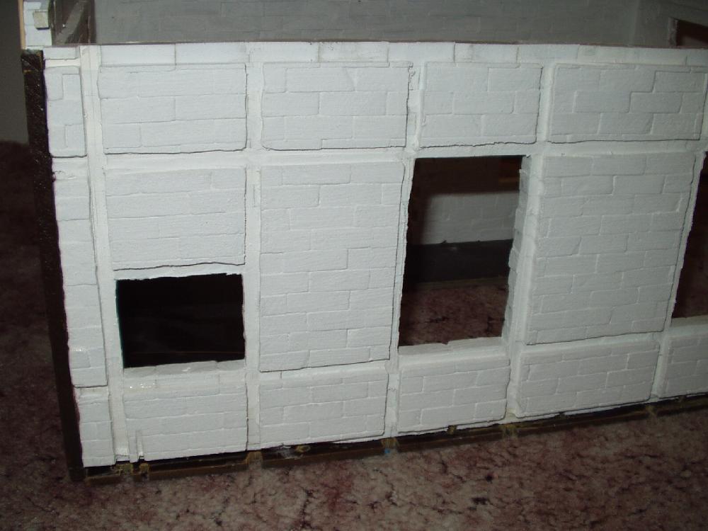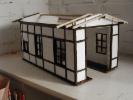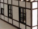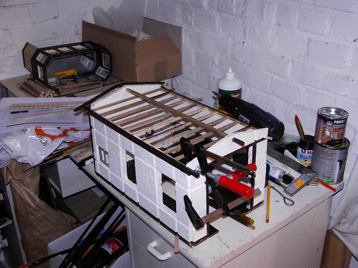 2004 war der Beginn des Rohbaues. Nachdem ich den Rohbau beendet hatte wurde das Gebäude von aussen und innen mit Fassadenfarbe gestrichen. Am Anfang war meine Überlegung ob ich das Fachwerk drauf klebe und die Zwischenräume mit 5mm Styropor ausfülle. Wie man auf den Bildern sehen kann, habe ich mich für eine andere Variante entschieden. Bei dieser Variante kommen für meine Begriffe die Steine besser zur Geldung. Hierzu habe ich mit einer großen Tischkreissäge Fugen ins Material geschnitten und die Holzleisten, die ich vorher imprägniert und mit Zaunslasur (Palisander) gestrichen habe, eingeleimt. Als Holzleisten nehme ich 5mmx5mm und 7mmx7mm. Die stammen alle von Silvesterraketen und liegen ja bekanntlich am 1.1. auf der Straße herum und kosten nichts. Ich hoffe meine Erläuterung waren ausführlich und ich bin für weitere Fragen und Anregungen offen.